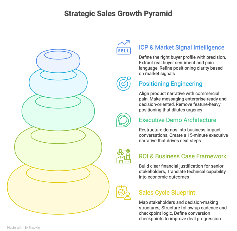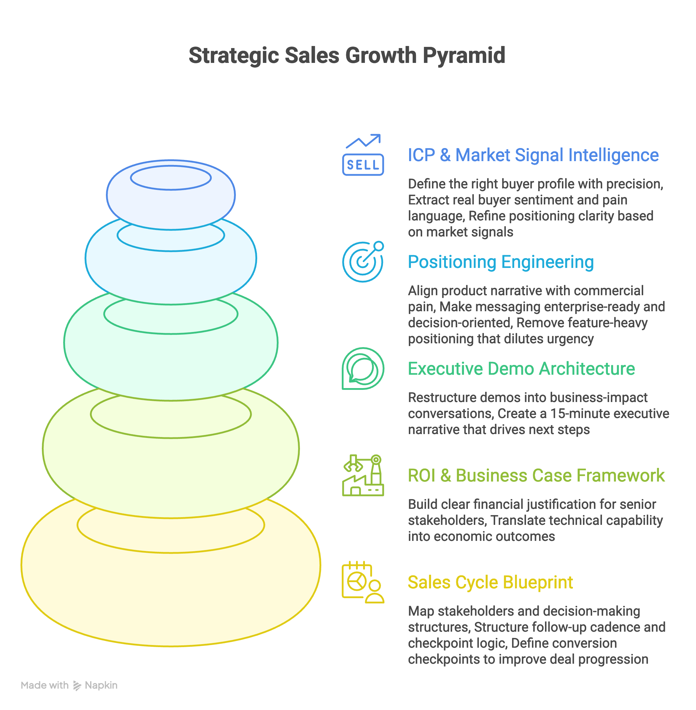 From first cold call to enterprise close, we design and pressure-build the sales architecture funded B2B AI startups need to win complex deals.